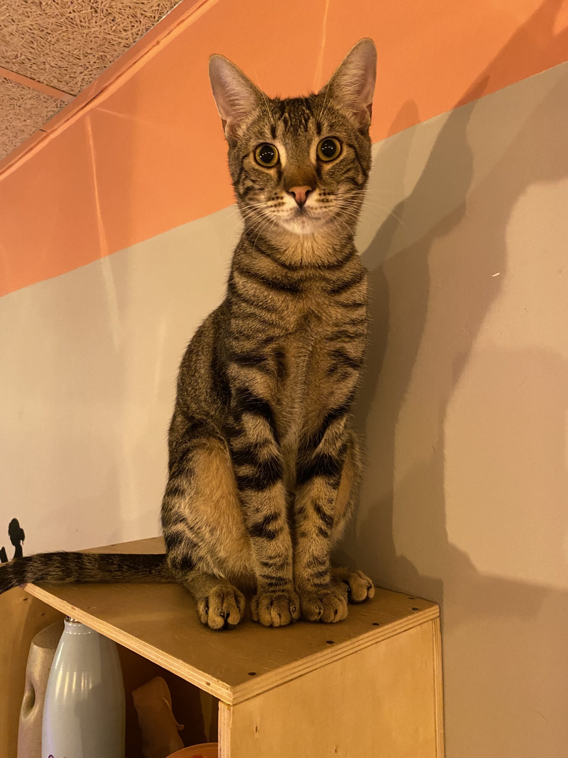 Soy un gato activo y muy cariñoso, me encanta jugar y saltar alto. Puede que me veas alguna vez saltando al hombro de algún humano en busca de mimos y caricias.
